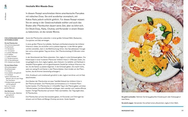 Alle vegetarischen Rezepte in diesem Kochbuch sind unkompliziert, mühelos nachkochbar und anhand der Zeitangaben perfekt mit dem Familienalltag kompatibel. Im Kapitel „Quick“ finden Sie Rezepte, die wenig Arbeit bedeuten und die sich aus dem zubereiten lassen, was der Vorratsschrank hergibt. Diese Rezepte sind perfekt für Mittage an Wochen- und Home-Office-Tagen. Das Kapitel „Slow“ konzentriert sich auf Rezepte für Tage, an denen das Kochen zelebriert werden möchte, Gerichte für die Familie und für Freunde, die wir am besten in Gemeinschaft genießen. Außerdem werden schnelle und langsame Frühstücksideen vorgestellt und auch süße Desserts, Gebäck und Kuchen dürfen im Buch nicht fehlen.