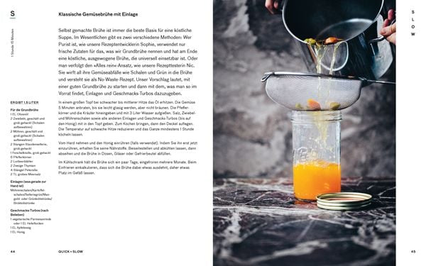 - Grundzutaten mit Wumms : Klassische Gemüsebrühe mit Einlage / Ingwer-Knoblauchpaste / Herzhafter Buchweizen-Crunch / Granola-Butter / Schnelle Pinke Pickles