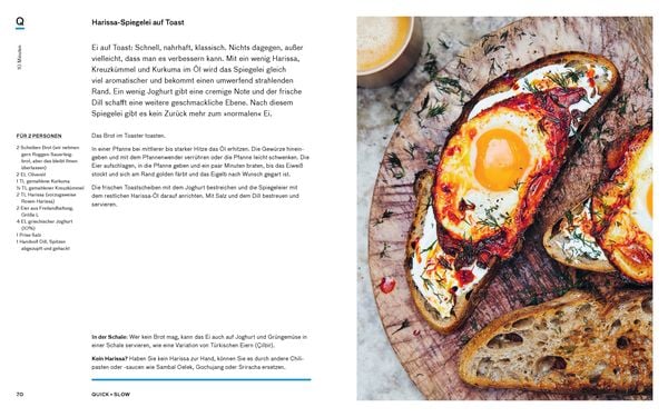 - Morgenstund : Harissa-Spiegelei auf Toast / Sonnenscheinsalat mit Kokosnuss-Creme + Kokos-Dukkah / Schoko-Waffel-Toast mit Granola-Butter