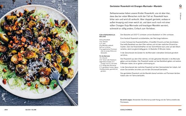 - Slow - Ruhige Momente : Kürbis-Quiche mit Zwiebeln + Grünkohl / Kimchi-Quinoa-Burger / Langsam gegartes Gemüse-Ragù / Griechischer Kartoffel-Eintopf / Koreanische Salat-Wraps mit Pilz-Steaks