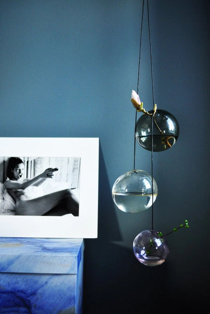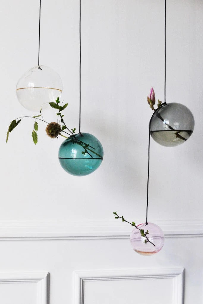 Die Hängevasen sind neben grün auch u.a. erhältlich. auch in Rosa und einem schönen warmen Bernsteinton und es ist schön, verschiedene Farben in einem kleinen hängenden Stillleben zu kombinieren. Ersetzen Sie Blumen je nach Stimmung und Jahreszeit durch Pflanzen, sodass Sie immer ein neues kleines Kunstwerk haben. In dieser Vase können Sie einzelne Blütenstiele oder wurzelnde Stecklinge verwenden. Mit der Zeit füllen die Wurzeln die Blase immer mehr aus und sehen immer beeindruckender aus. Wenn Sie eine unkomplizierte Alternative wünschen, können Sie die Vase mit einer unserer eleganten Papierblumen kombinieren.