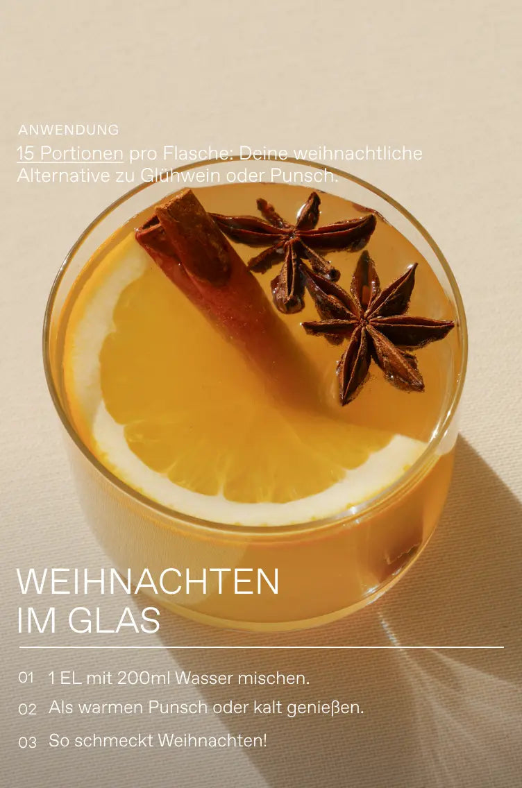 Zum Weihnachtsessen, als Glühwein-Alternative oder wann immer du dir das Dezember-Feeling ins Glas holen willst. Einfach 1 EL Christmas Oxymel mit einem Glas Wasser, Sekt oder Saft mischen, umrühren und fertig. Kalt und warm ein Genuss!