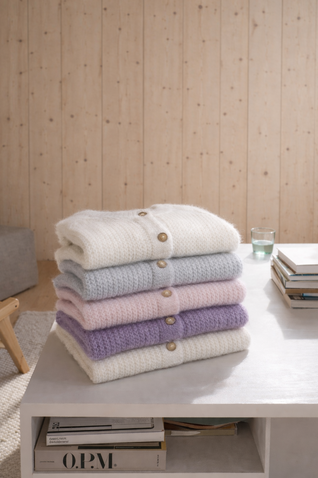 Breite Ärmel mit leichtem Volumen verleihen der Strickjacke eine moderne, lässige Note, während der Rundhalsausschnitt und die gerippten Abschlüsse den Look ruhig und ausgewogen halten. Das feine Mohair-Garn schenkt angenehme Wärme und hohen Tragekomfort, ohne dabei schwer zu wirken.