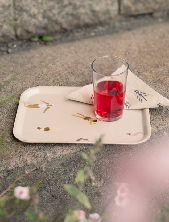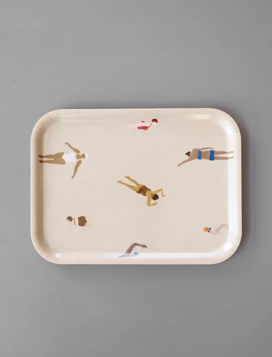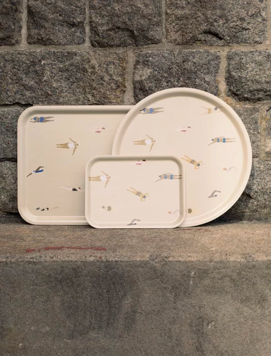 Das Swimmers Tablett 20 x 27cm von der schwedischen Marke Fine Little Day ist ein rechteckiges Tablett aus laminiertem Birkenholz mit einem humorvollen Motiv von schwimmenden Menschen in verschiedenen Positionen, entworfen von Elisabeth Dunker. Das Tablett eignet sich perfekt sowohl für Frühstück und Kaffeepause als auch zur Aufbewahrung von Ölen, Essig und Gewürzen auf der Küchenarbeitsplatte. Die Swimmers Tablett ist in verschiedenen Größen erhältlich und wird zu einem sowohl charmanten als auch praktischen Einrichtungsgegenstand.