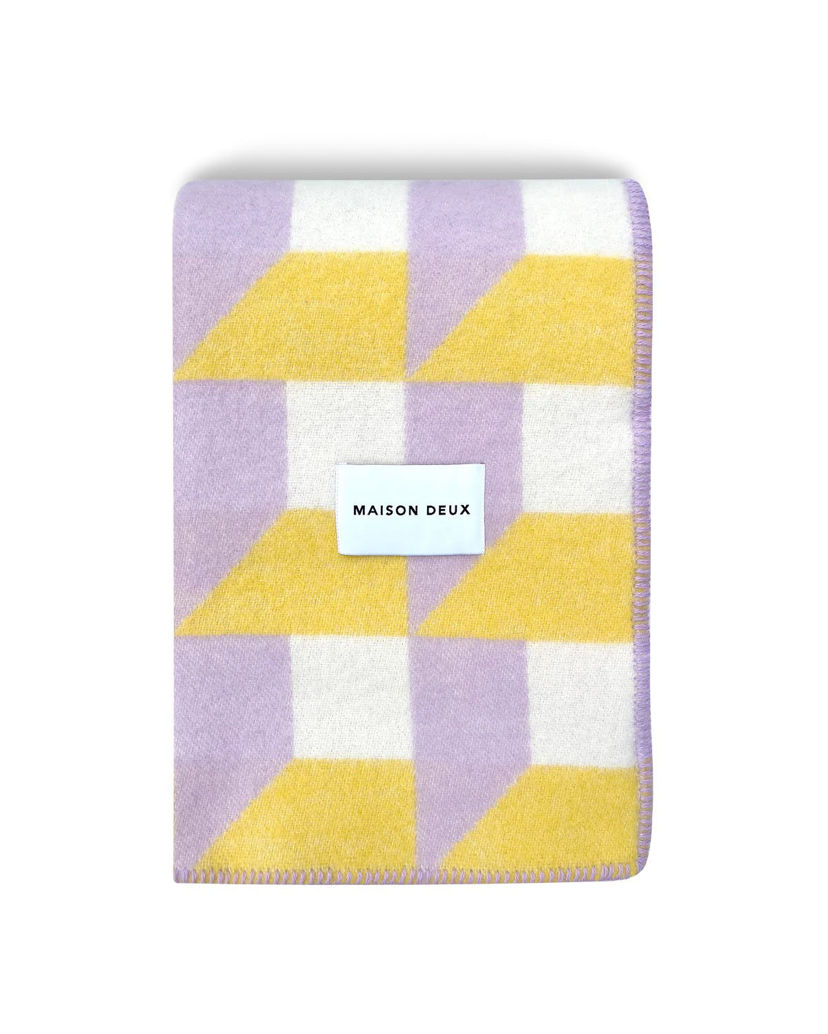 Die Cubics-Decke Lila Sonne ist aus 100 % neuseeländischer Wolle jacquardgewebt und mit Nähten entlang der Ränder versehen. Eine dicke Decke, die auf der Rückseite spiegelverkehrt ist. Mit Abmessungen von 130 x 200 cm ist sie groß genug, um auch Platz für zwei zu bieten. Sie hält Sie warm und wertet ihr Wohnzimmer optisch auf.