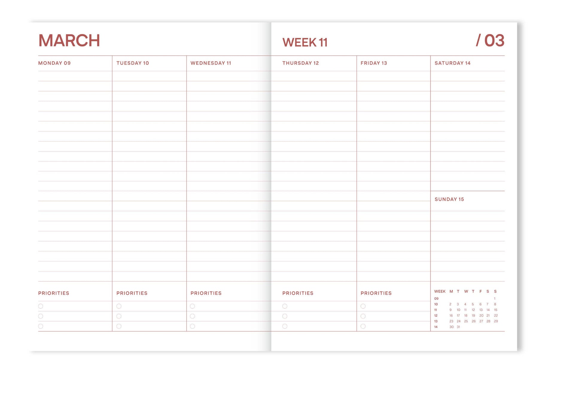 Ebenfalls praktisch: Unten bleibt für jede Woche zusätzlicher Platz für Aufgaben und Notizen. So sind immer alle Infos direkt beisammen. Und was gibt es Schöneres, als mit einem schönen leeren Tagebuch neue Jahrespläne zu schmieden?