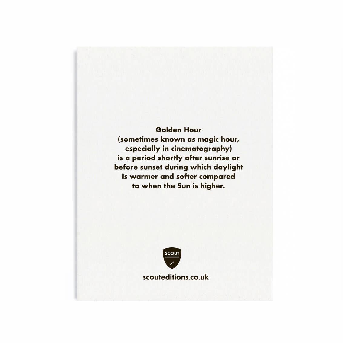 Rückseite der Karte: „Die goldene Stunde (manchmal auch als magische Stunde bekannt, insbesondere in der Kinematographie) ist eine Zeit kurz nach Sonnenaufgang oder vor Sonnenuntergang, in der das Tageslicht wärmer und weicher ist als bei höherer Sonne.“