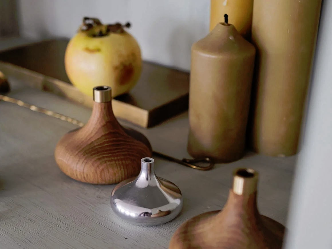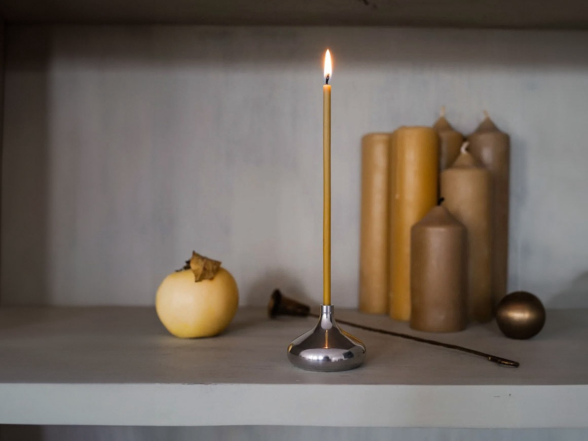 Der OVO Things Kerzenhalter Aluminium besticht durch seine hochwertige Verarbeitung aus schön poliertem Aluminium. Das ungewöhnliche Zusammenspiel von warmen Tönen der Bienenwachskerzen von OVO Things kommt in diesem glänzend silbrigen Metallkerzenhalter besonders festlich zur Geltung. Diese edle Variante des Kerzenhalters ist die kleine Schwester des OAK Kerzenhalters. In die Öffnung des Kerzenhalters passen alle schlanken Slim candles von OVO Things mit einem 6 Millimeter Durchmesser.