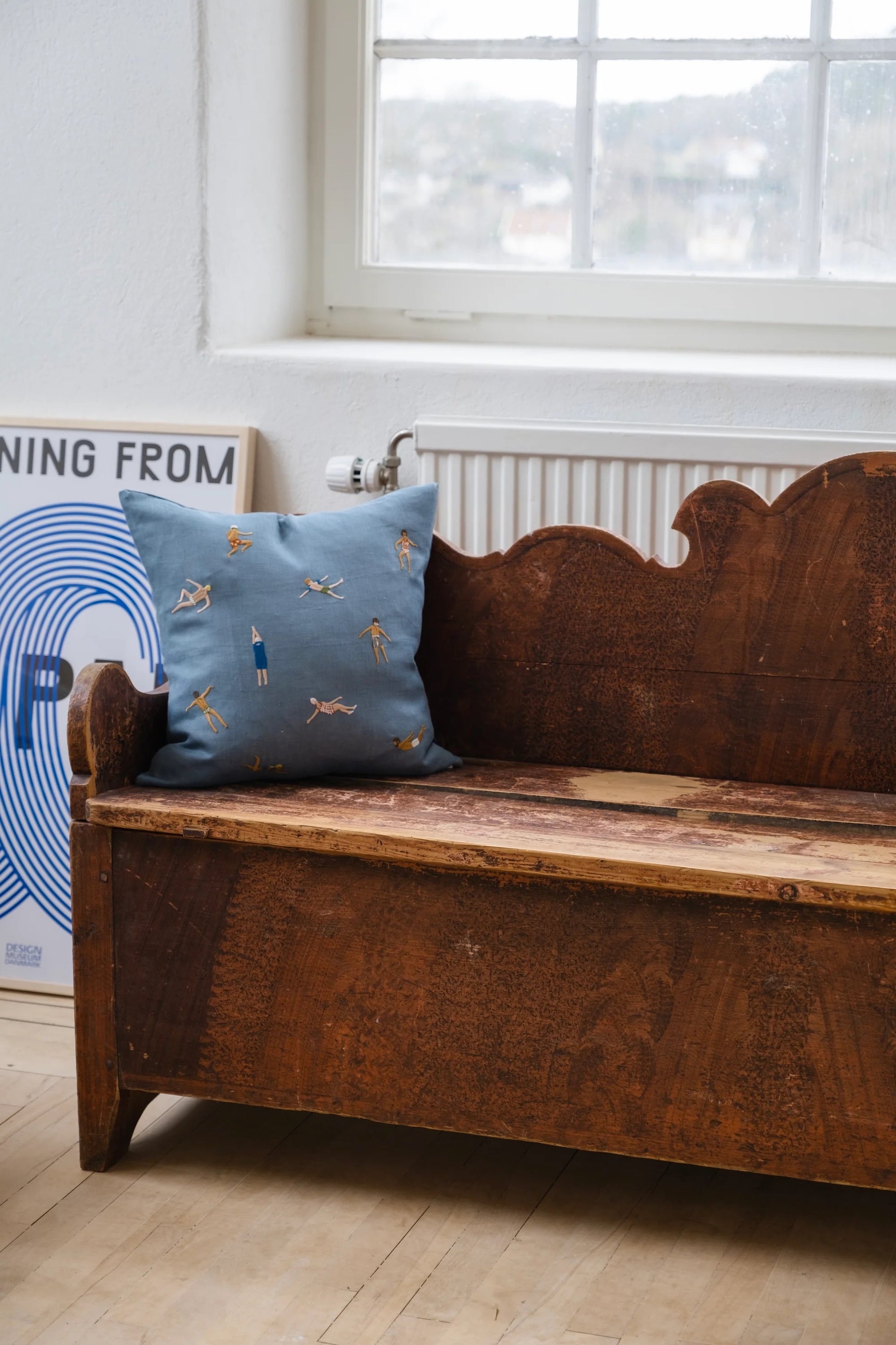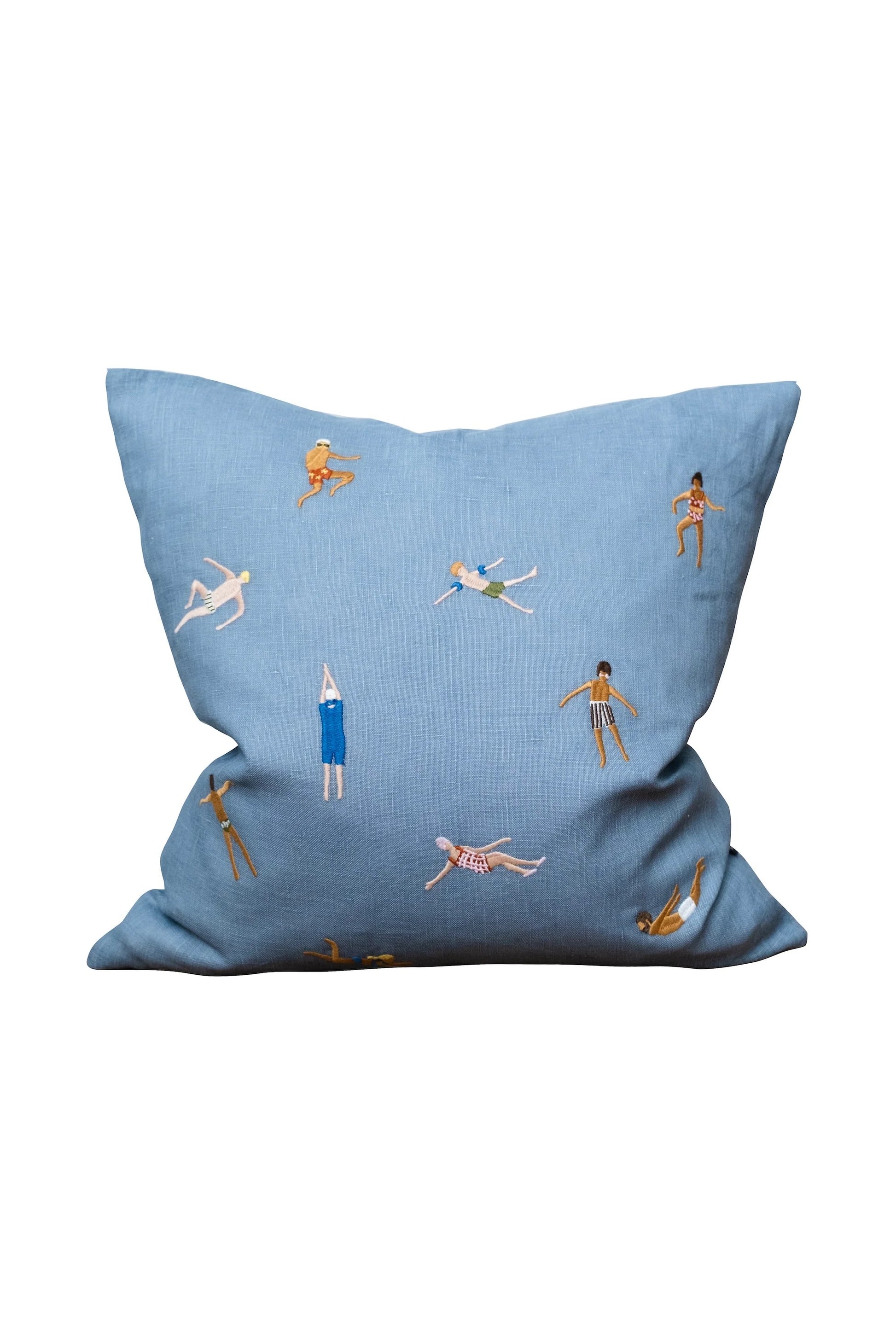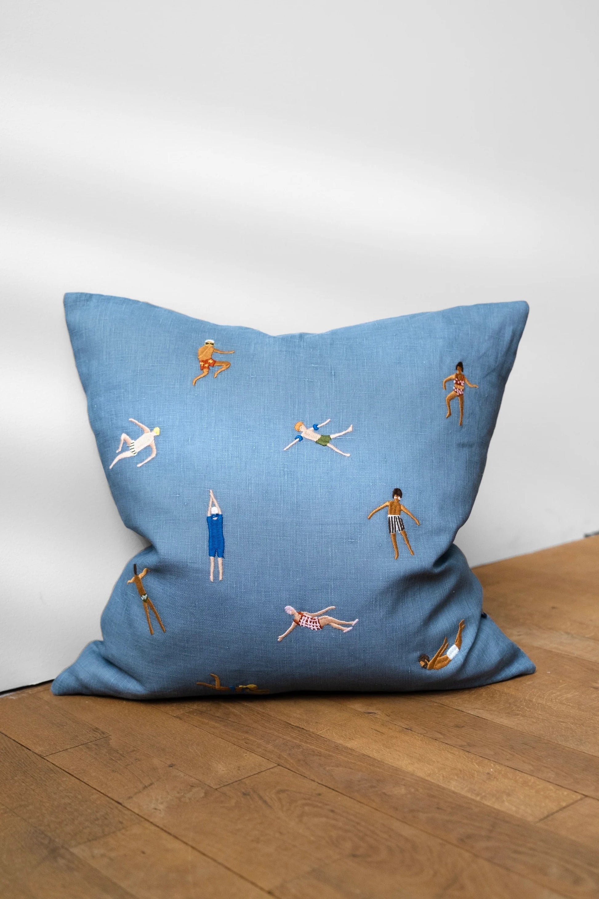 Bestickter Kissenbezug auf schwerem Leinengewebe mit dem Kunstwerk Swimmers von Fine Little Day. Egal wie das Wetter ist, wir wollen eintauchen.
