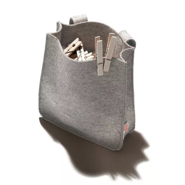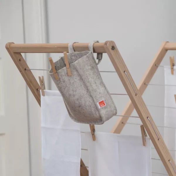 Der Klammerbeutel Filius von side by side ist die praktische Ergänzung zu unserem Wäscheständer "Mama" aber auch zu allen anderen Wäscheständern. Mit Hilfe von 2 Schlaufen mit Klettverschluss am Rücken, wird der Klammerbeutel einfach an den Wäscheständer gehängt. Der Klammerbeutel kommt inklusive 50 Wäscheklammern und besteht aus echtem Wollfilz (grau meliert).