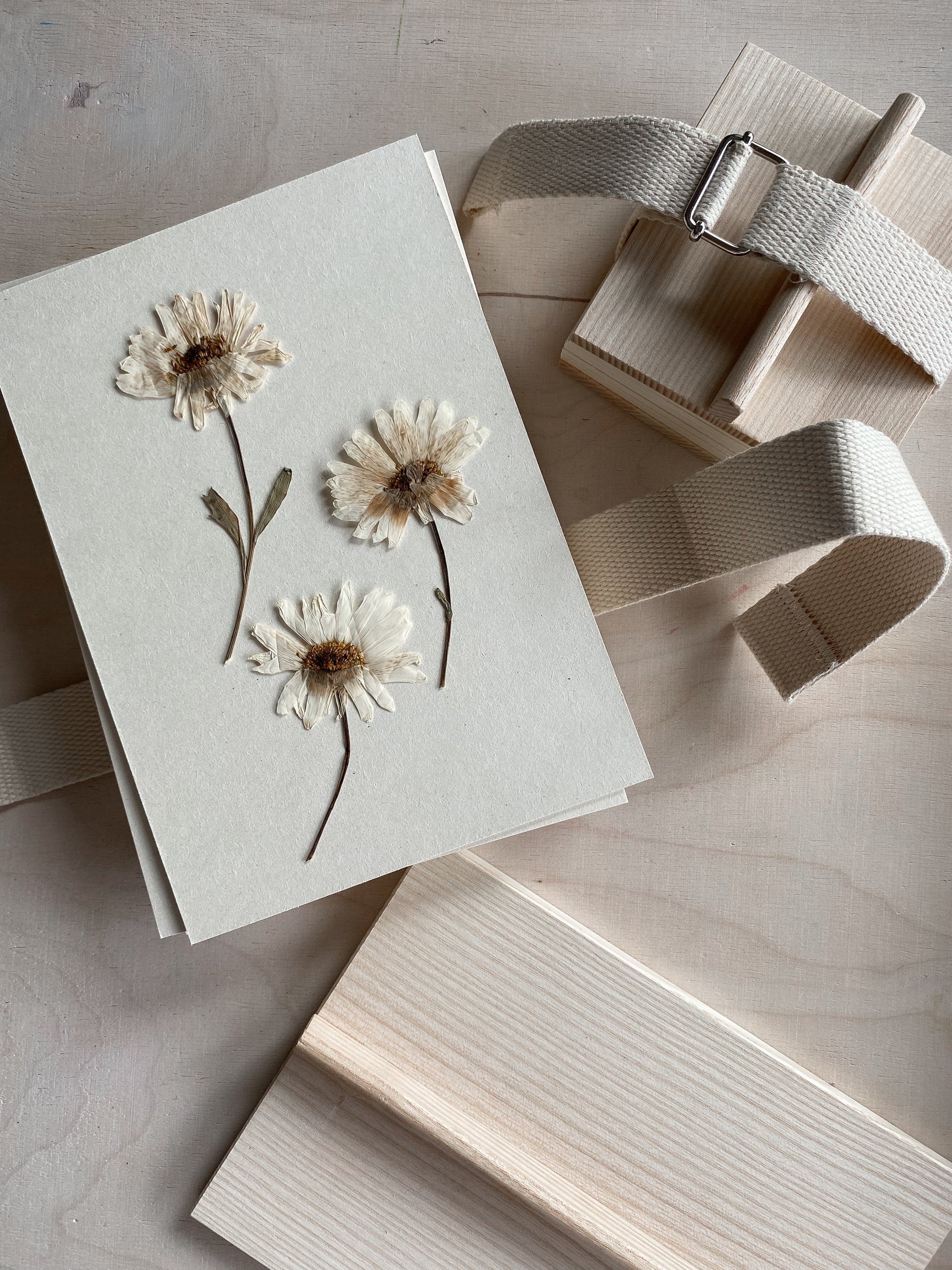 Wunderschöne Blumenpresse aus Holz mit stabilen Kartoneinlagen im Buchformat DIN A5 und Gurtband natur. Holzpresse / Blütenpresse für Blumen, Gräser, Blätter, Blüten und vieles mehr.