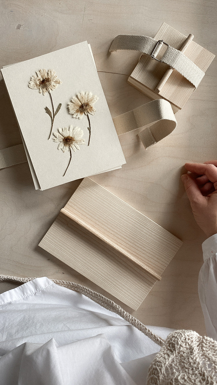 Blumenpresse A5 aus Holz, Gurtband in Natur