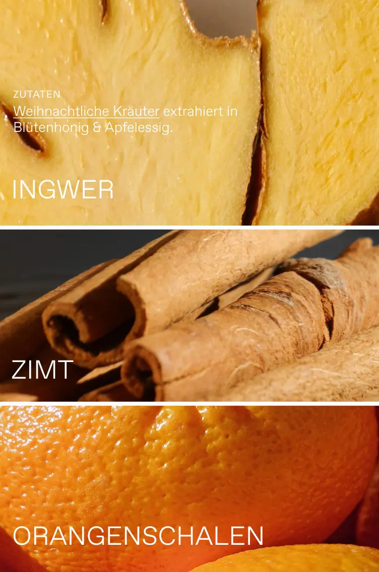 Zum Weihnachtsessen, als Glühwein-Alternative oder wann immer du dir das Dezember-Feeling ins Glas holen willst. Einfach 1 EL Christmas Oxymel mit einem Glas Wasser, Sekt oder Saft mischen, umrühren und fertig. Kalt und warm ein Genuss!