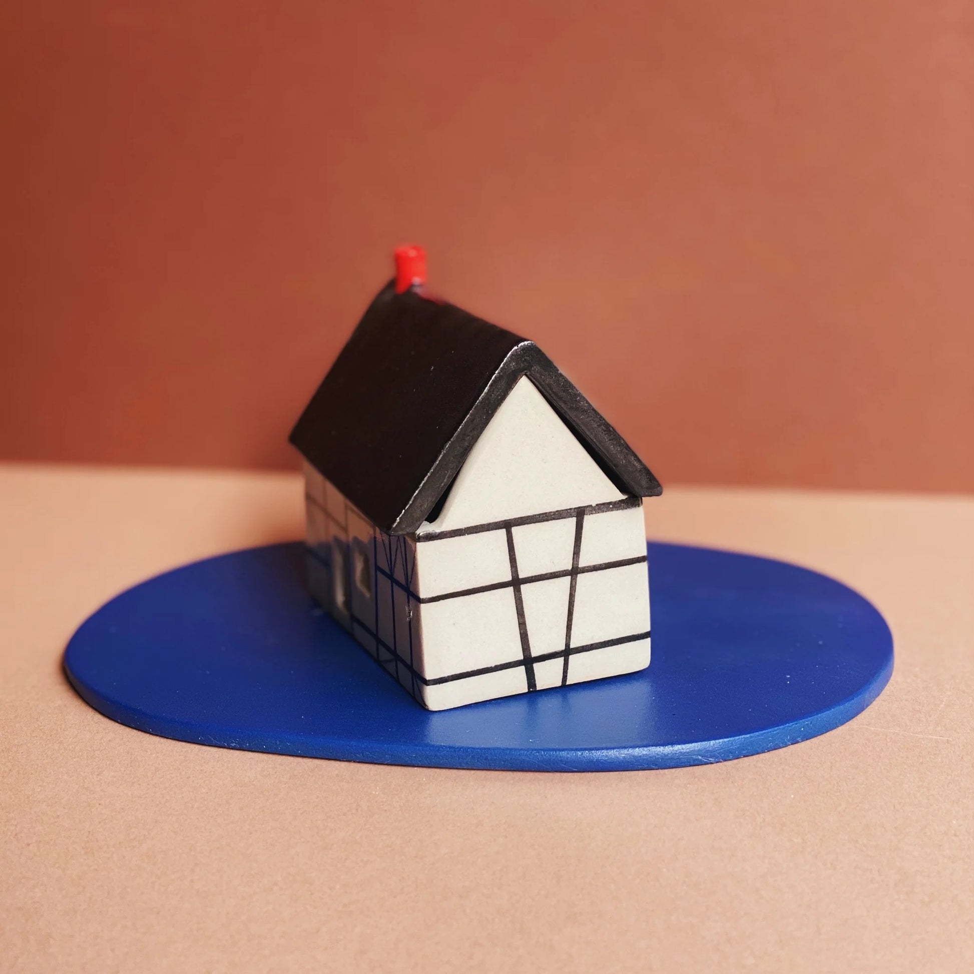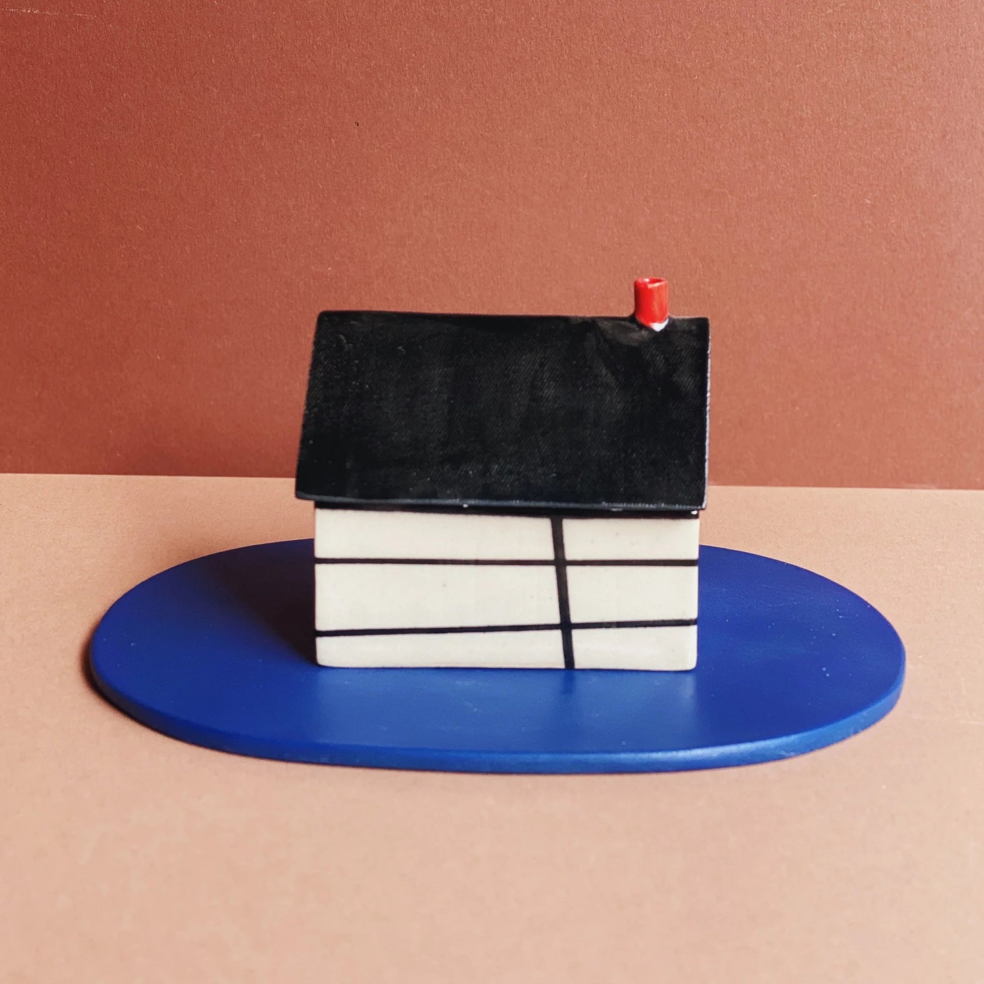 Handgefertigtes Häuschen aus Steinzeug, illustriert mit farbigen Engoben und Unterglasuren und einem Finish aus transparenter, glänzender Glasur. Jedes Häuschen wird in einem eigens dafür gestalteten Karton und einer kleinen Überraschung versendet.