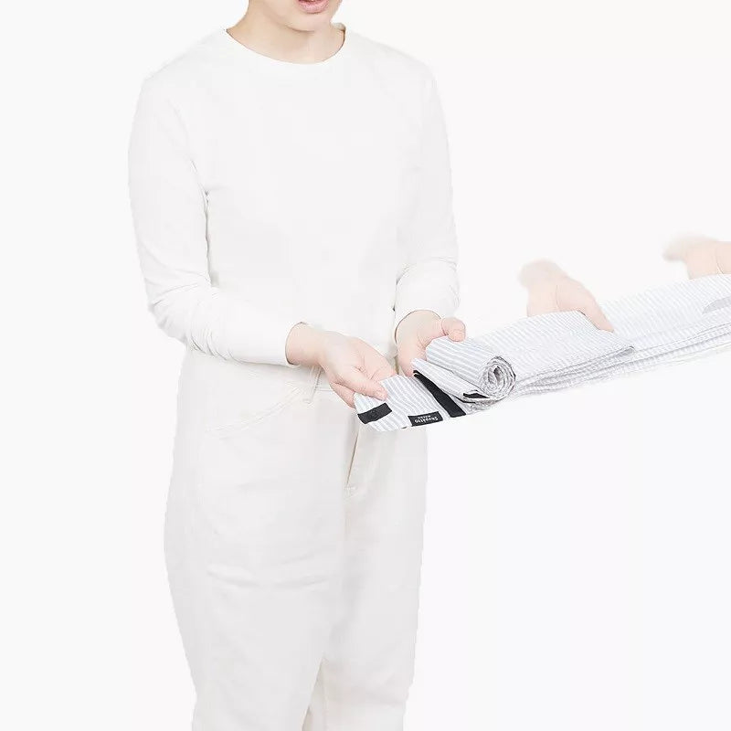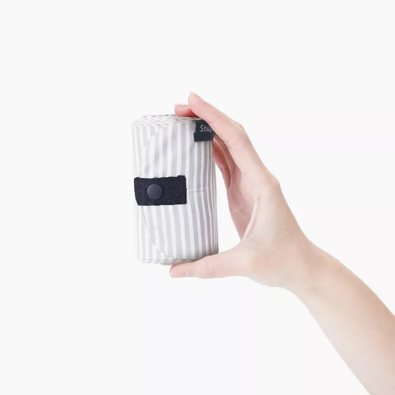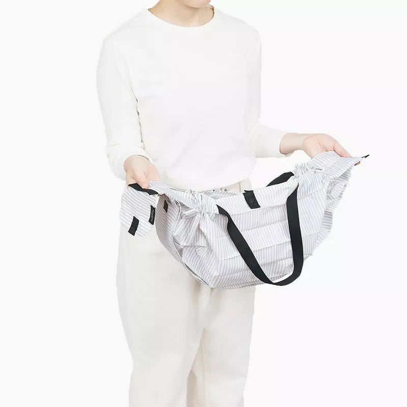 Die innovative Struktur von Shupatto ist wirklich großartig. Ziehen Sie an beiden Enden und der Beutel fällt entlang der Falte zusammen. Infolgedessen rollt es sich leicht zu einem kompakten Bündel wieder zusammen. Für dieses innovative Konzept erhielt Marna internationale Preise. Einschließlich der Red Dot und iF Design Awards.